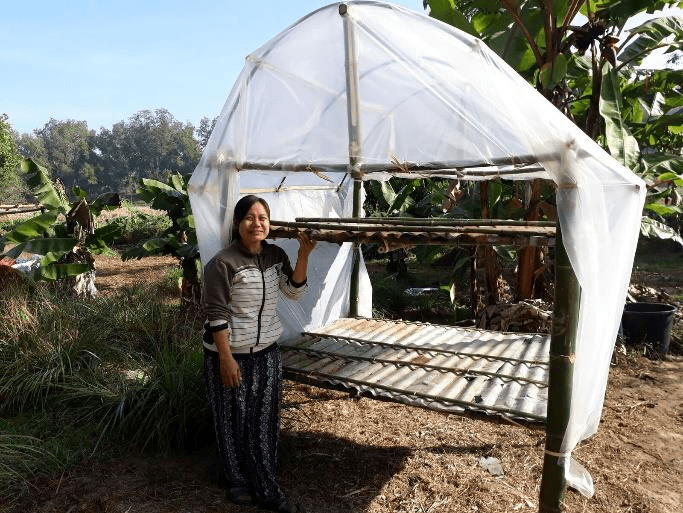 - Figure 6. Naw Doris (seed bank staff at the Kahelu Farm) standing next to a newly built solar seed drying rack.